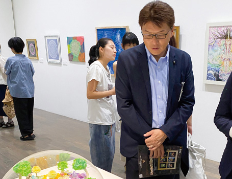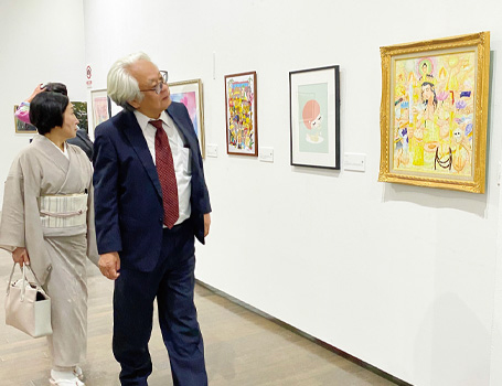 開催初日に駆けつけてくださった、国際平和美術会名誉顧問で元UNESCO日本国政府代表部特命全権大使の木曽功氏と令夫人、金沢市・文化政策課課長の本島一二氏から大変高い評価を頂戴することが叶いました。また夕刻より、ANAクラウンプラザホテル金沢にて実施された開催記念パーティーでは、ご出展の皆様と、木曽功氏がご参加になり、盛況のままレセプションパーティーは終了。
